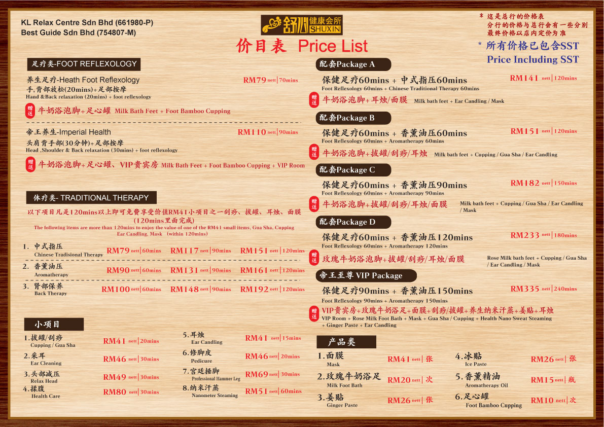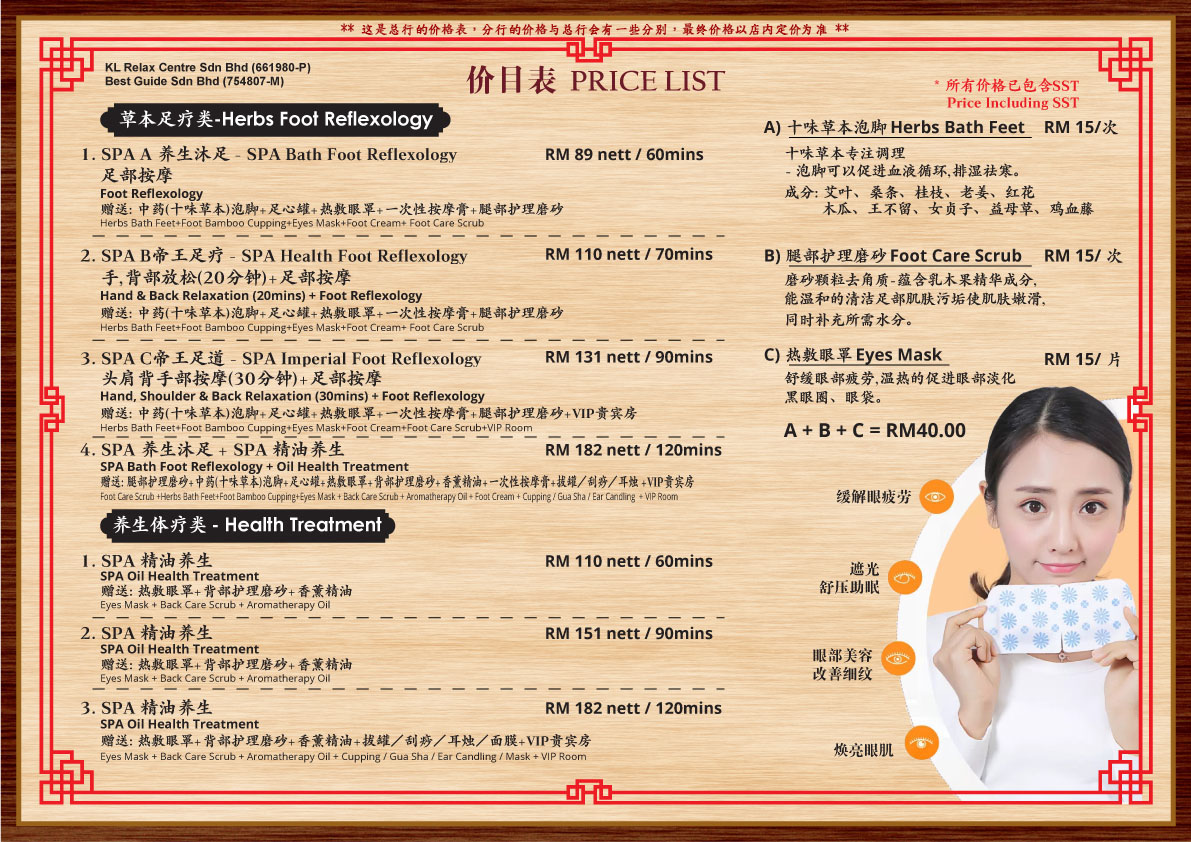 养生足疗 Health Foot Reflexology 足部拔罐 Foot Cupping 香薰油压 Aromatherapy Massage 背部刮痧 Back Scraping 背部拔罐 Back Cupping 耳烛 Ear Candle